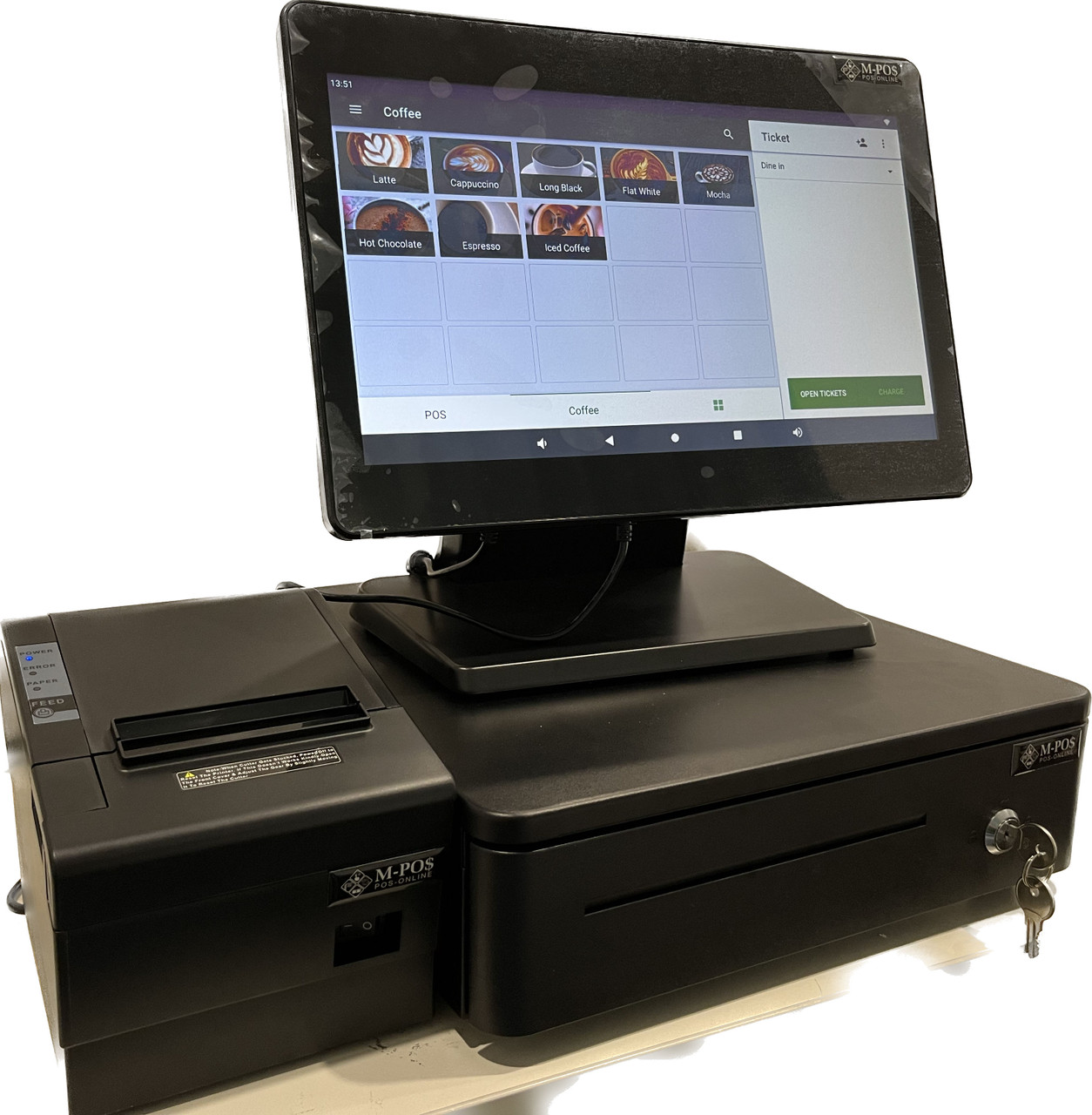 Printer: MPOS-M30 80mm Thermal Receipt Printer. This printer comes with its own power supply, USB cable and driver disc. It has USB/LAN interfaces and can be connected by any of these methods. The RJ12 cable can control the opening of the cash drawer & is located on the back of the printer. |